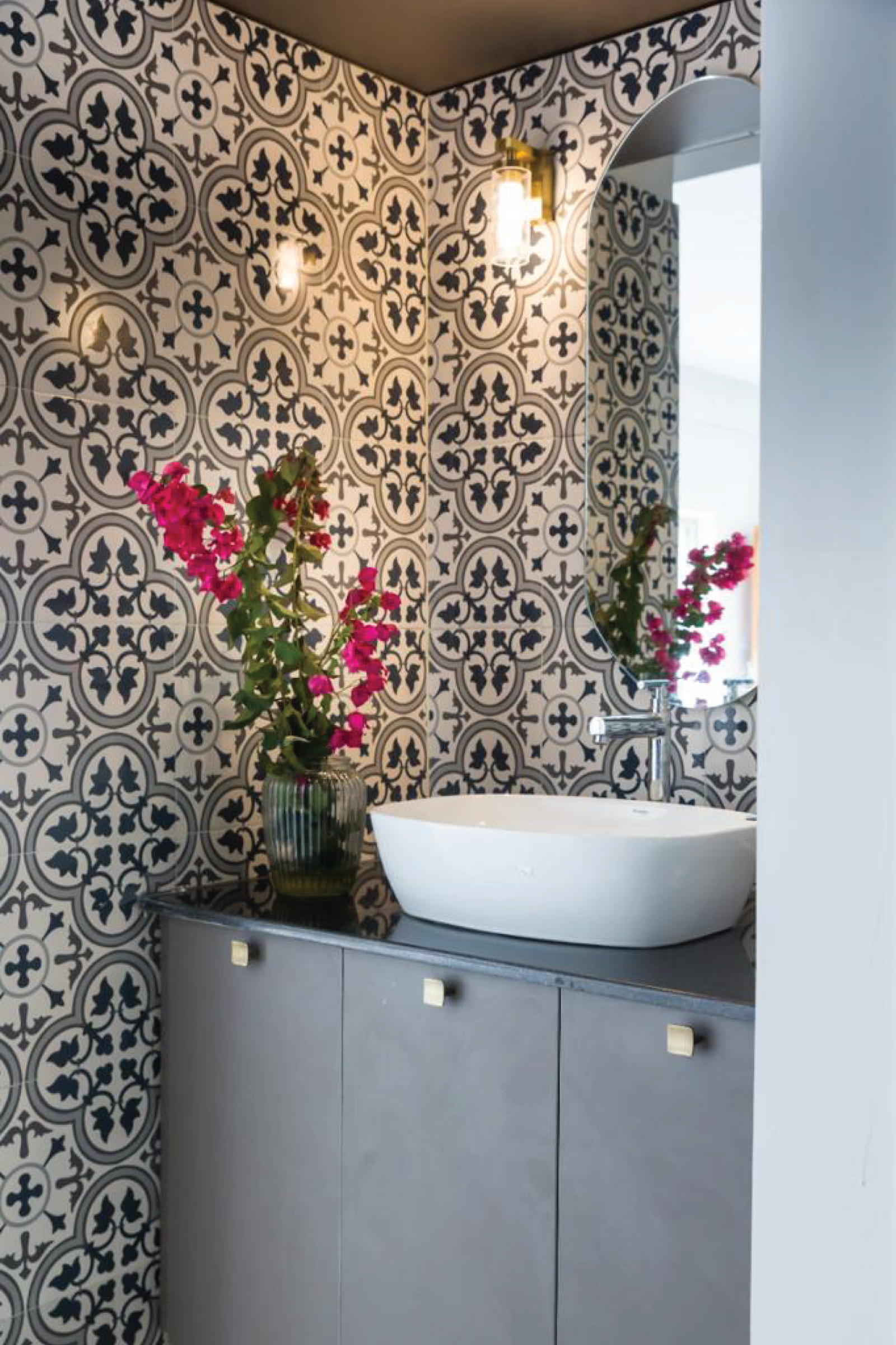 A standout design element is the vanity area that sits near the entrance a floral patterned backsplash tile makes it feel almost boutique like. Paired with a modern mirror and minimal counter, it offers guests a beautiful first impression, and adds a layer of quiet sophistication.